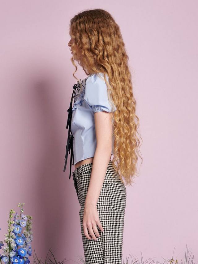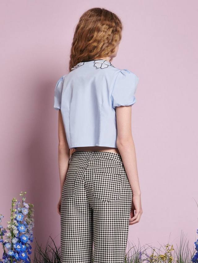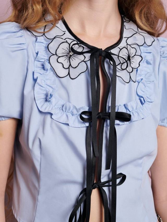 Укороченный топ из мягкой ткани. Завязывается на регулируемые атласные завязки и украшен воротником из органзы с цветочным принтом.