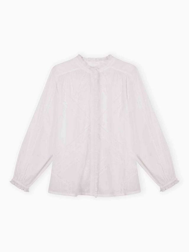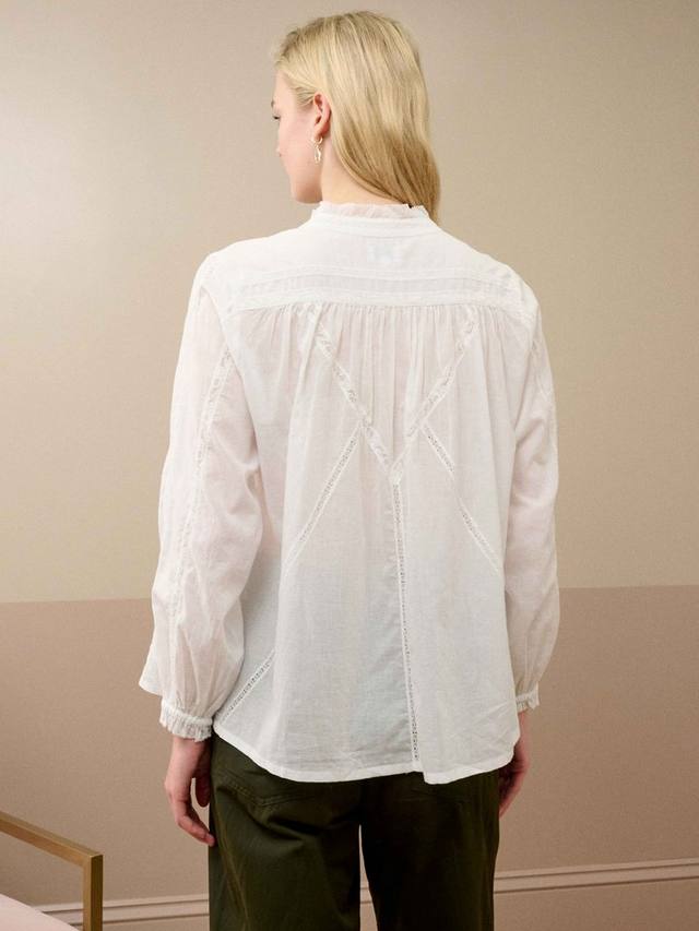 Эта шикарная блузка, являющаяся свидетельством непревзойденного дизайна Brora, украшена кружевными вставками в винтажном стиле, манжетами с ресничками и женственными оборками вдоль выреза и потайной планкой, все на хлопковой основе в тонкую полоску.