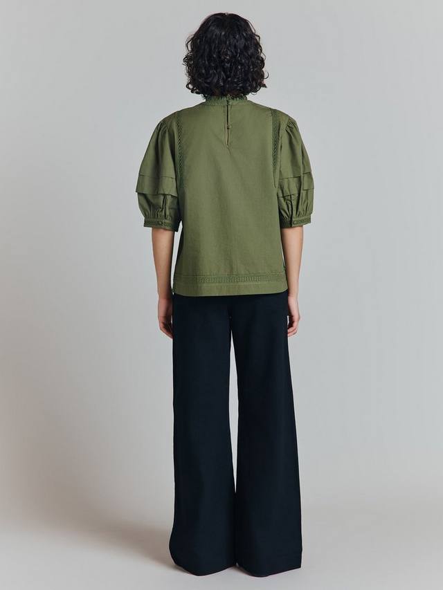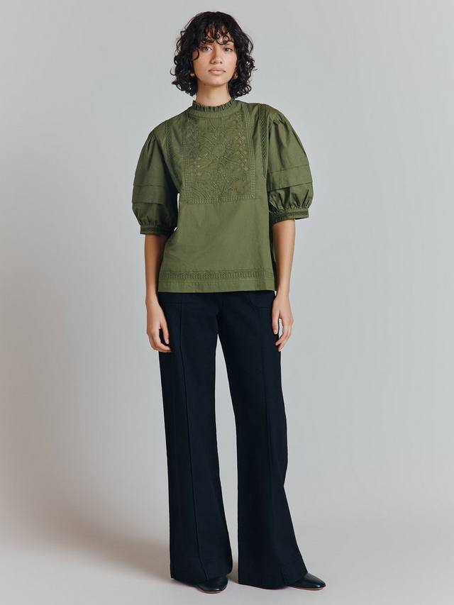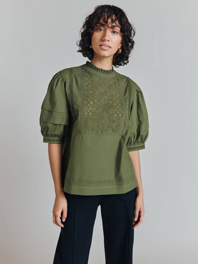 Красивая блузка — это всегда вещь, в которую стоит инвестировать. Взять, к примеру, Lucie. Она сшита из хлопкового поплина, имеет аппликацию с ажурной отделкой спереди, круглый вырез с изящной оборкой и кружевную отделку по подолу и манжетам. Она идеально подходит для создания образа, превратив ваши любимые джинсы или самые простые брюки в нечто особенное. Сзади вырез-замочная скважина.