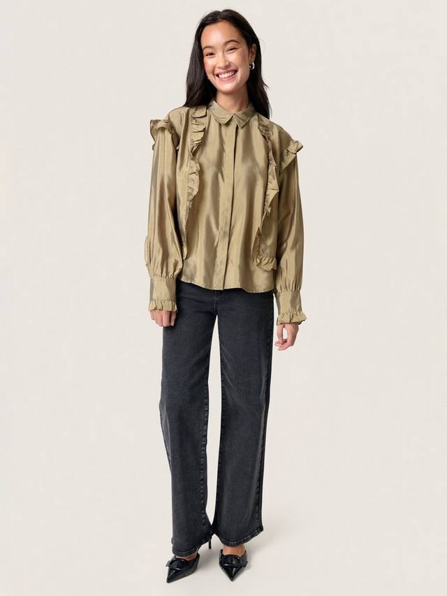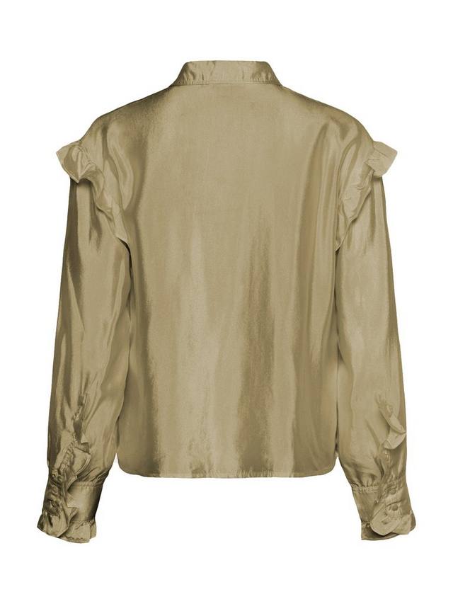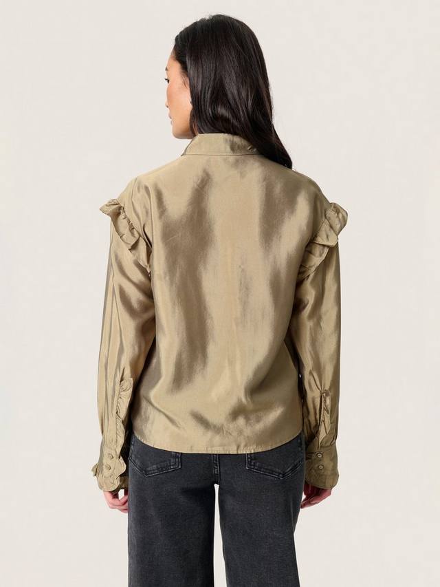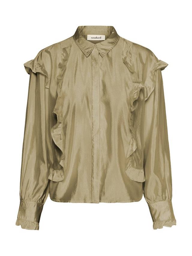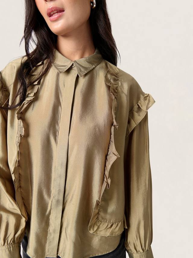 Рубашка Karolina — женственный и жизнерадостный фасон, который можно носить по любому поводу. У неё отложной воротник, потайные пуговицы и оборки на плечах, спереди и по краям рукавов. Рукава длинные, объёмные, с манжетами на пуговицах, а сама рубашка имеет отрез по бедрам.