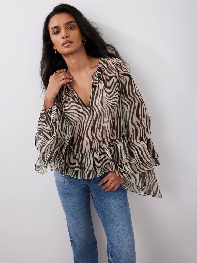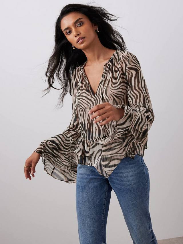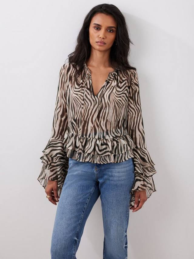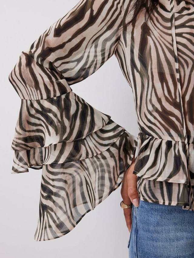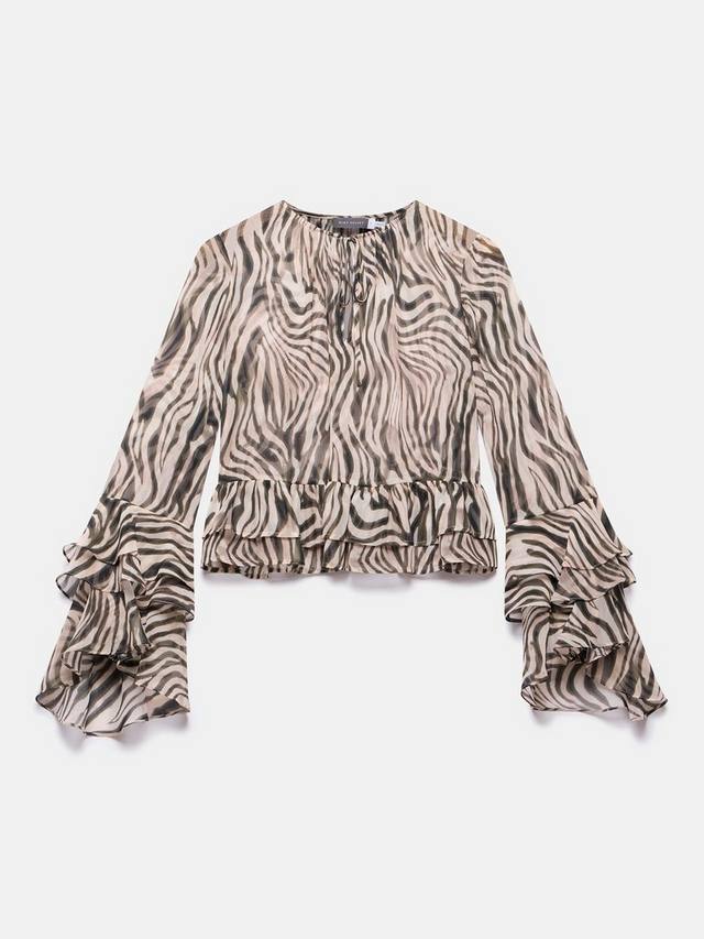 Топ с принтом зебры укороченного силуэта с круглым вырезом, замочной скважиной, длинными рукавами с воланами, рифлеными манжетами, воланами по низу и завязкой спереди.