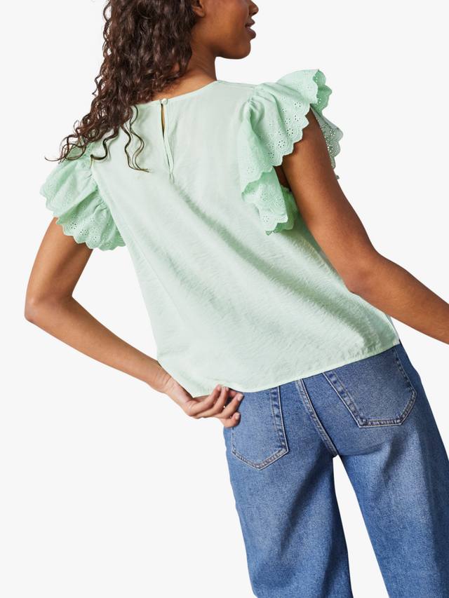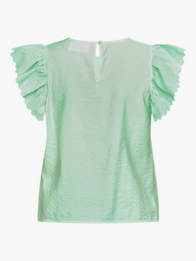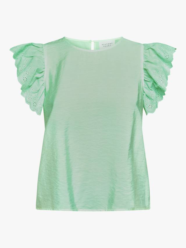 Vidar — женственный и элегантный топ с короткими рукавами и круглым вырезом. Рукава украшены изящными оборками и английской вышивкой, которые придают ему романтичный вид.