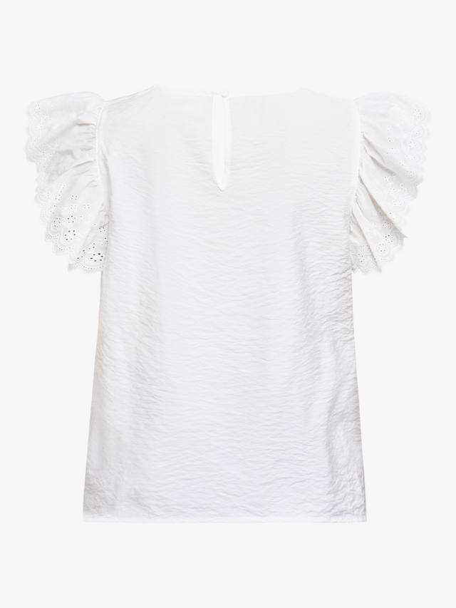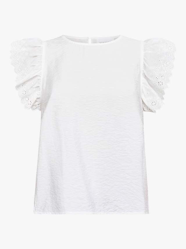 Топ Vidar — женственный и элегантный топ с короткими рукавами и круглым вырезом. Рукава украшены изящными оборками и английской вышивкой, которые придают изделию романтичный вид.