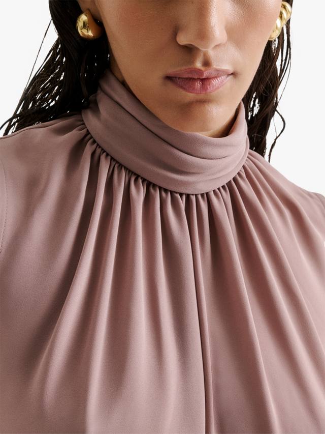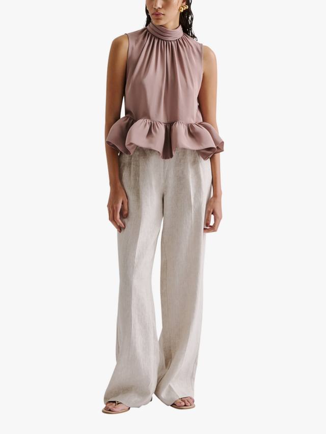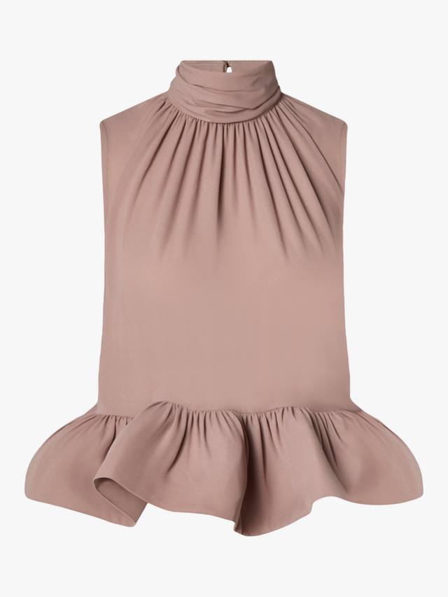 Блузка без рукавов с американской проймой от Malina превращает повседневные моменты в запоминающиеся моменты благодаря присборенной высокой горловине и оборчатому подолу с баской.