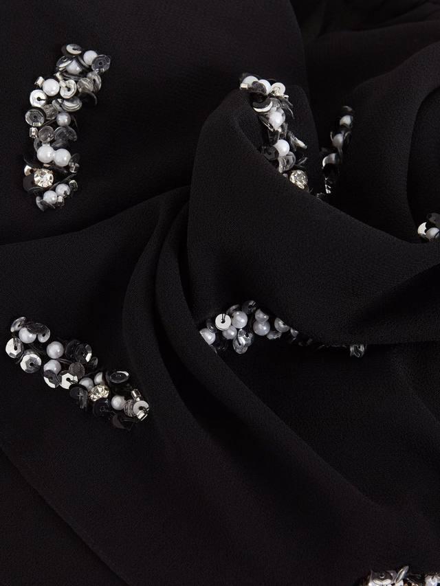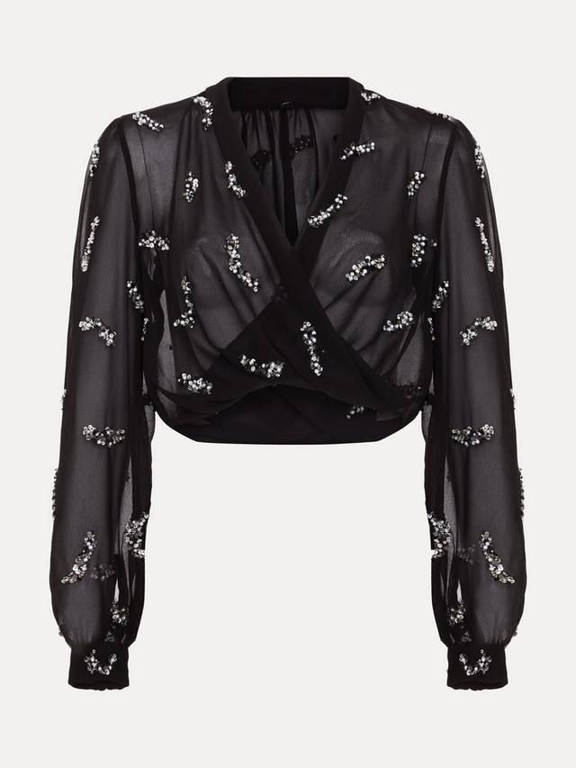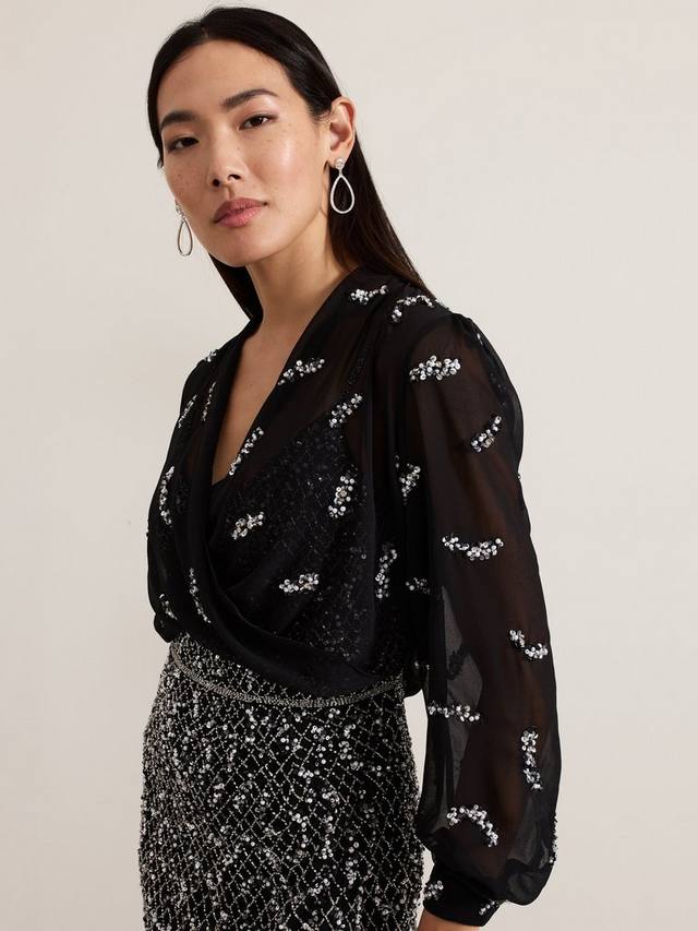 Накидка Annette выполнена из полупрозрачного шифона, украшена пайетками и имеет укороченный фасон халат, который идеально дополнит любой ваш образ на мероприятие.