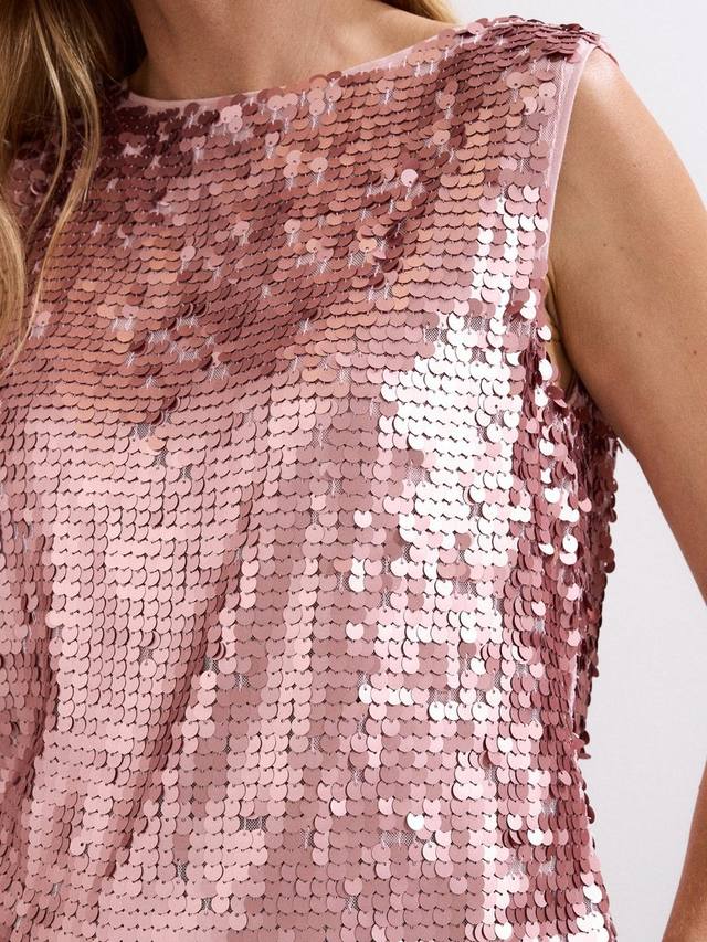 Пусть этот стиль заговорит сам за себя в этом праздничном сезоне. Этот топ без рукавов, украшенный эффектными пайетками, имеет классический силуэт, привлекающий внимание к блеску. Универсальный, но притягивающий взгляд, он отлично сочетается с черными широкими брюками и вашими любимыми туфлями на каблуке, создавая современный образ для вечеринки.