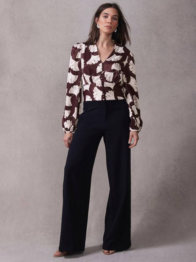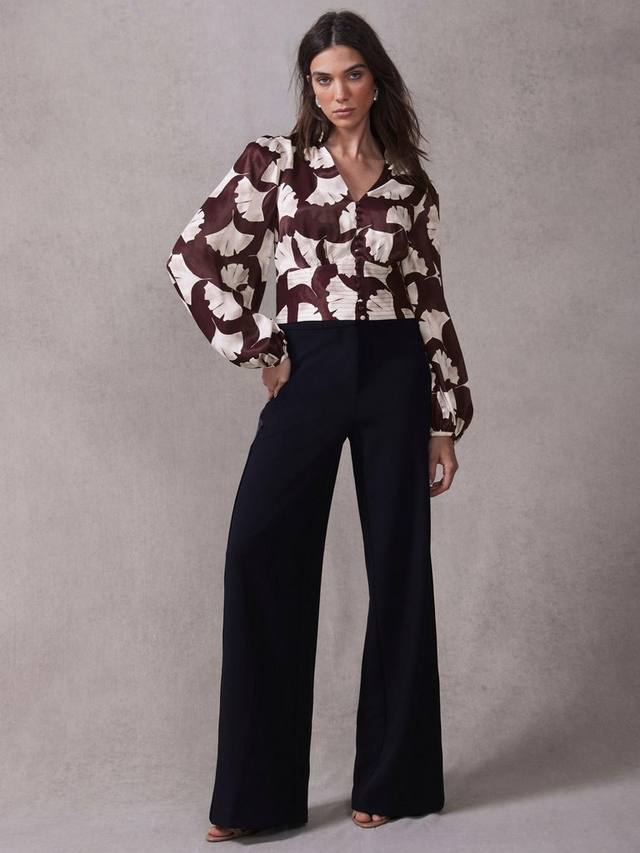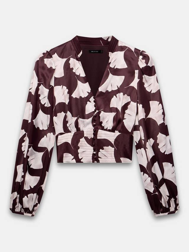 Топ с принтом гинкго укороченного силуэта с V-образным вырезом, отложным воротником, присборенными плечами, длинными рукавами, манжетами на пуговицах, отложным воротником на талии, сборкой на спинке с застежкой на пуговицы спереди.