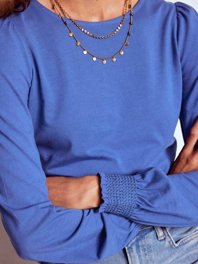 Присборенные манжеты придают этой простой и стильной кофте с длинными рукавами изюминку. Наденьте её под трикотажную майку или носите отдельно, заправив в джинсы с высокой талией.