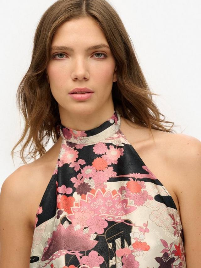 Стильный и изящный, топ с жаккардовым воротником-халтер – идеальное решение для летнего обновления. Благодаря привлекательному и модному сочетанию халтера и открытой спины, он станет отличным вариантом для праздничного вечера, а благодаря цветочному узору его легко стилизовать. Халтер и открытая спина завязываются на завязки, а на подоле – небольшая фирменная металлическая застежка.