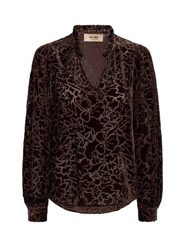 Эта блузка с V-образным вырезом украшена подробным бархатным цветочным узором с выжженным узором и длинными рукавами. Идеально подходит для элегантных вечерних выходов или шикарного дневного образа.