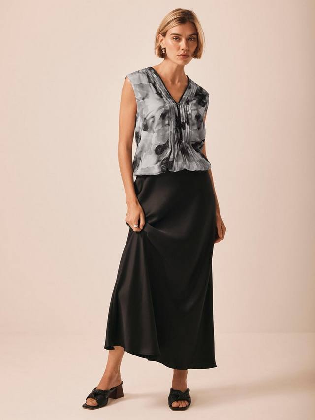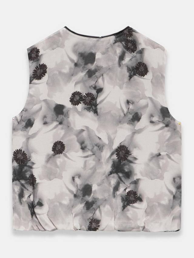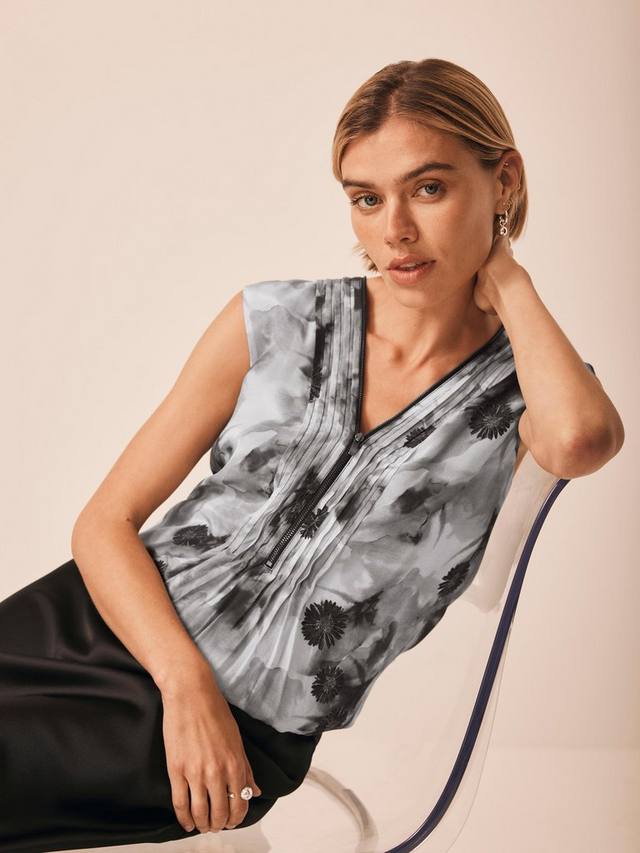 Топ без рукавов с цветочным принтом, V-образным вырезом, защипами, присборенным эластичным поясом с отделкой на молнии и застежкой спереди.