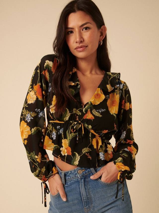 С работы до выходных. Этот топ с ярким гобеленовым цветочным рисунком, гофрированным воротником и красивыми завязками.