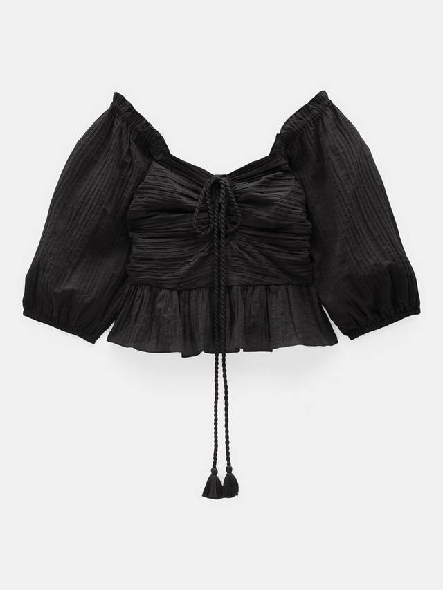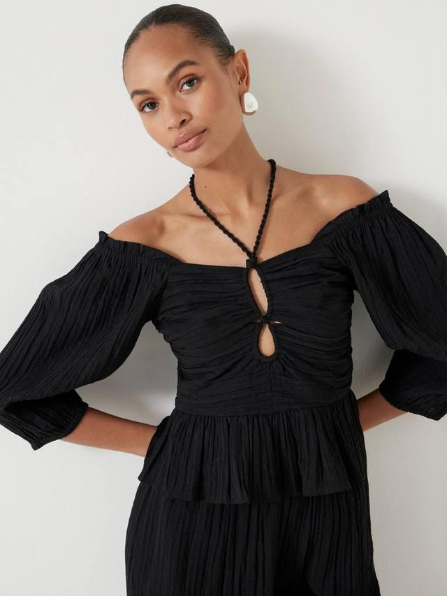 Простая одежда для торжественных случаев, которая при этом выглядит очень стильно? HUSH предлагает простой и удобный способ нарядиться. Топ Zoe с непринужденным вырезом-бандо и эффектной отделкой в виде веревок добавляет еще больше выразительности облегающему силуэту с расклешенными краями.