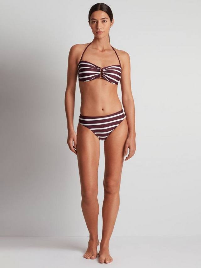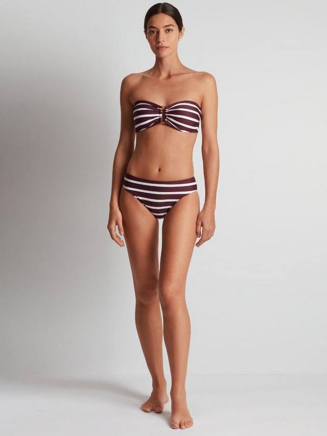 Лиф-бандо с современной золотой фурнитурой спереди и полосатым дизайном. Регулируемые и съемные бретели, съемные чашечки и застежка сзади для дополнительной застежки.