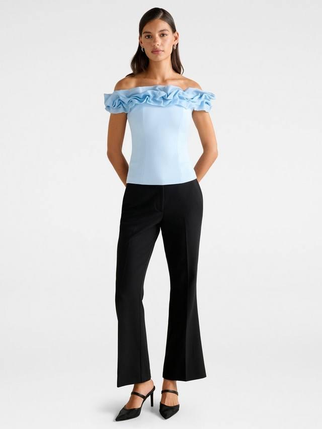 Приготовьтесь к празднику в топе с вырезом бардо от Forever New. Элегантный объемный вырез с рюшами создаёт неповторимый образ, а креповая ткань облегает тело.