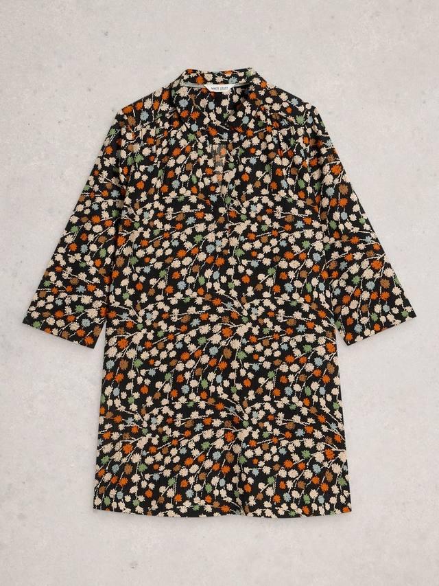 Удлиненная туника из 100% вискозы обеспечит комфорт в течение всего дня и подчеркнет фигуру V-образным вырезом. Абстрактный рисунок добавит индивидуальности, а рукава три четверти сделают её практичной для насыщенных дней.