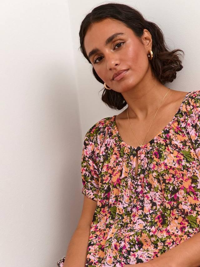 Янтарная туника — это повседневный и удобный топ с красивым принтом. Широкий круглый вырез, застегивающийся на пуговицы спереди, и свободный крой. Короткие рукава реглан, слегка расклешенные, с узкими манжетами на пуговицах. Туника имеет крой чуть ниже бёдер.