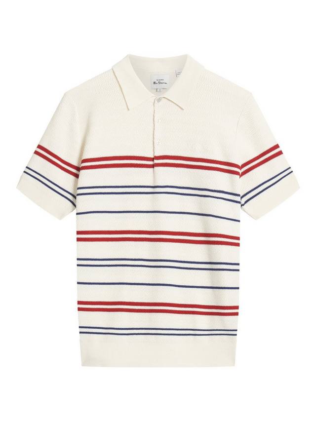 Этот трикотажный поло в полоску с рисунком елочка с короткими рукавами застегивается на три пуговицы и имеет вышивку Ben Sherman на левой стороне груди.
