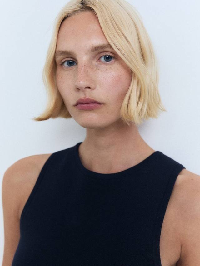 Это мини-платье без рукавов длиной до бедра от Mango – образец простоты: трикотажное полотно и круглый вырез без застежек.
