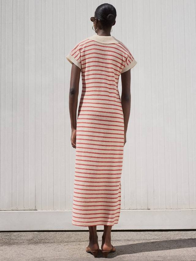 Это полосатое платье миди сочетает в себе игривые линии с продуманным V-образным вырезом для повседневного комфорта. Прямой крой подойдет для любого случая, придавая вам уверенности и легкости, куда бы вы ни отправились.