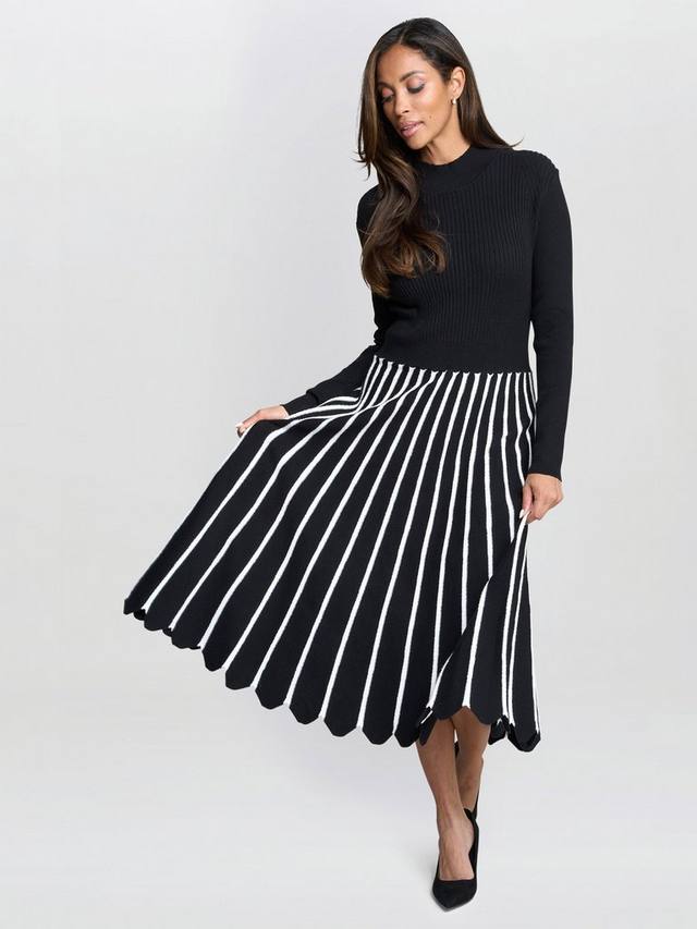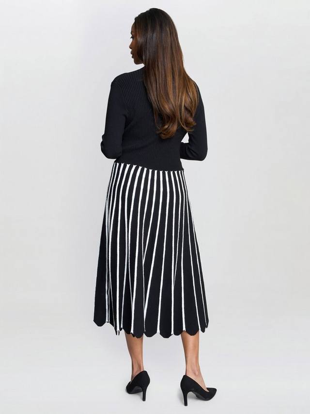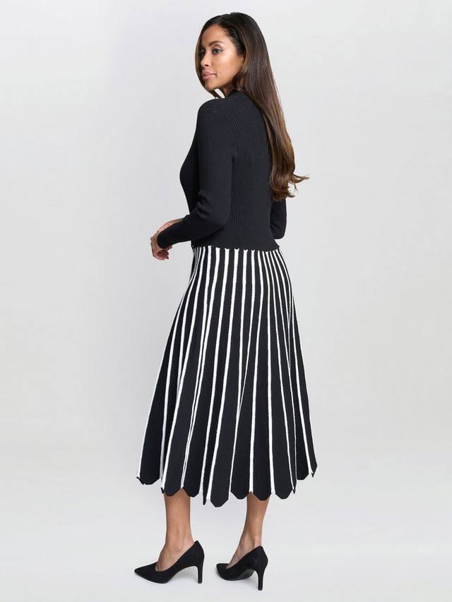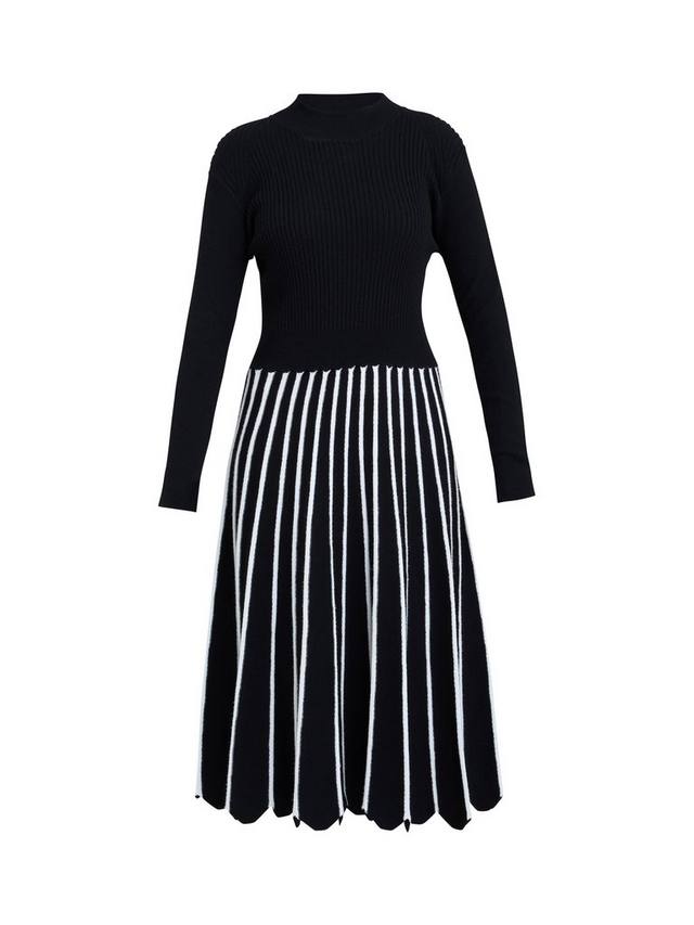 Классическое и изысканное. Это элегантное платье миди, подчеркивающее фигуру, имеет облегающий лиф в рубчик, который плавно переходит в расклешенную юбку с вертикальными полосками. Высокий вырез горловины и длинные рукава добавляют изысканности. Идеально подходит для офиса, свидания или дневного мероприятия.