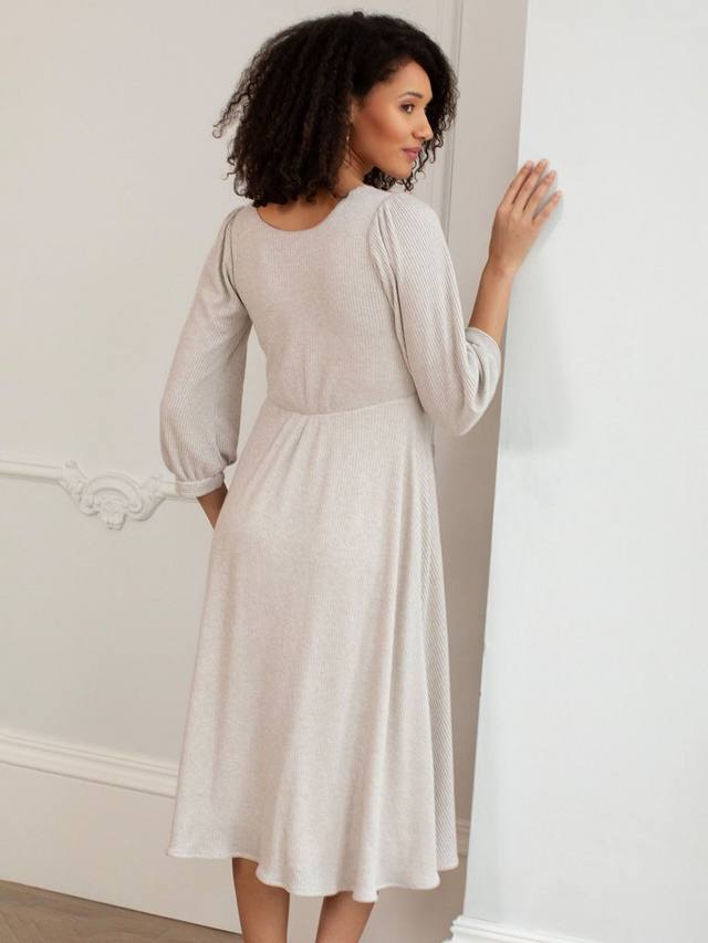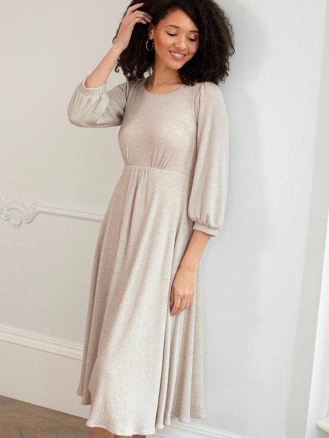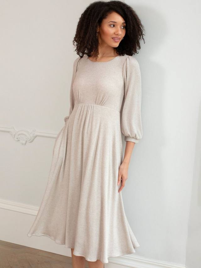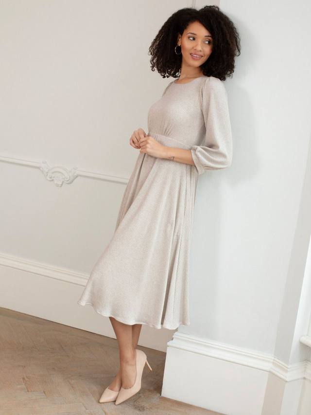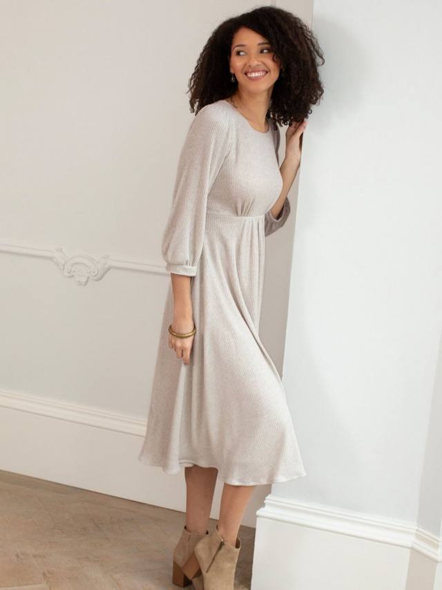 Сочетайте непринужденный стиль с продуманным комфортом. Трикотажное платье миди Kimberly выполнено из роскошного трикотажного джерси в рубчик с легким блеском. Легко надевайте через голову и откройте для себя новый любимый образ для торжества с массой непринужденного гламура. Потайные боковые карманы, свободные рукава и манжеты.