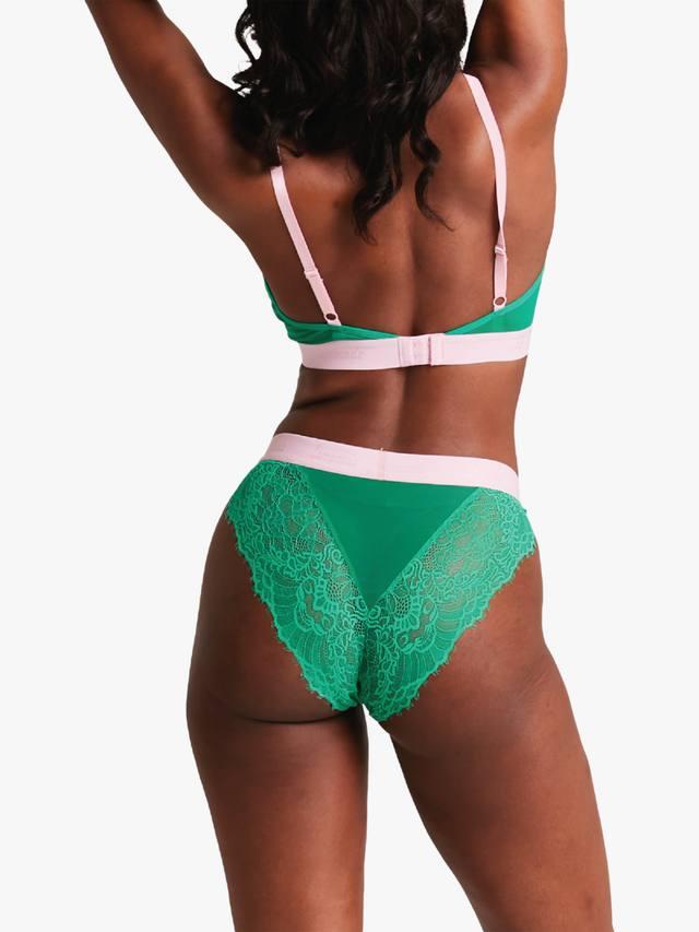 Трусики Synergy от Lemonade Dolls, выполненные из мягкой сетки с фестончатыми кружевными вставками в тон, отличаются ультракомфортной средней посадкой, контрастным эластичным поясом и средней или полной закрытостью ягодиц.