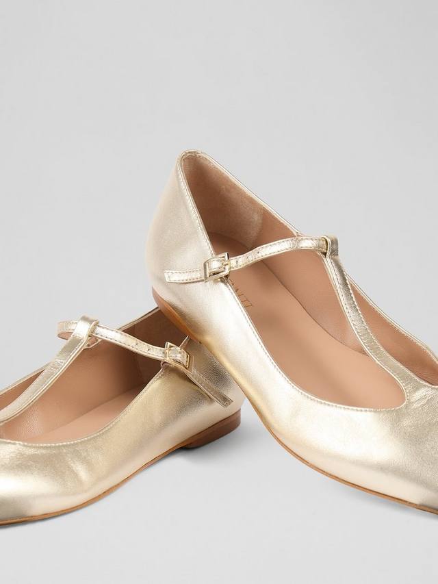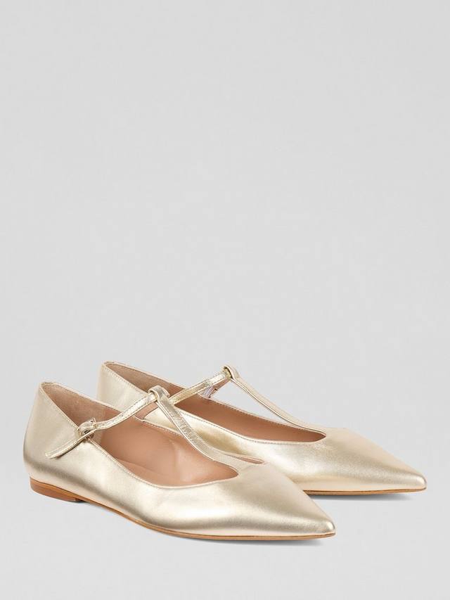 Ботинки Drew T-bar от LKBennett сочетают в себе изысканность и комфорт. Эти балетки изготовлены в Испании из роскошной золотистой металлизированной кожи с заостренным носком, воплощающим элегантный повседневный стиль.
