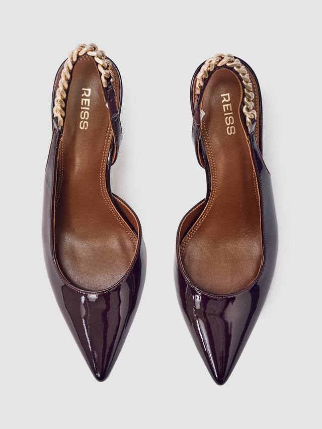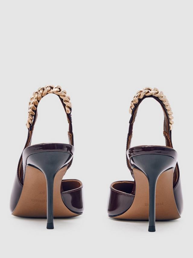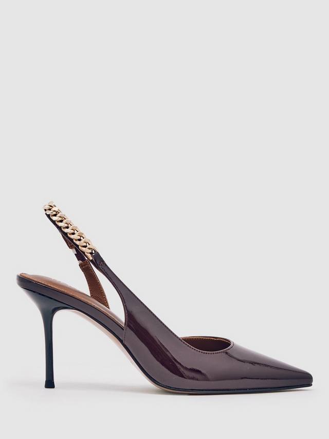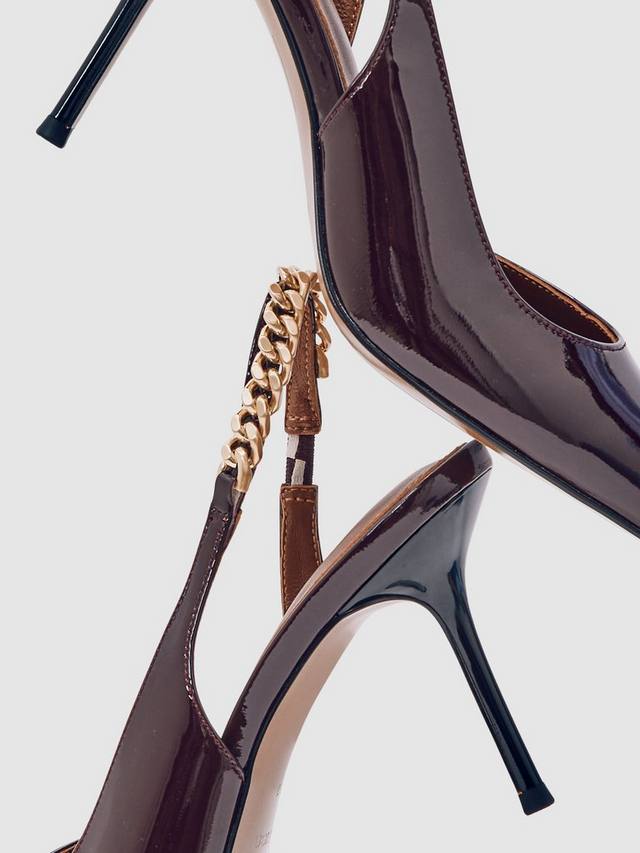 Туфли-лодочки с открытой пяткой из блестящей кожи с характерным острым носком. Золотистая фурнитура сзади также создает приятный контраст.