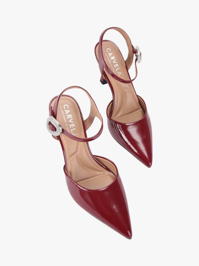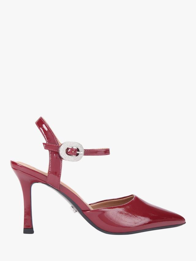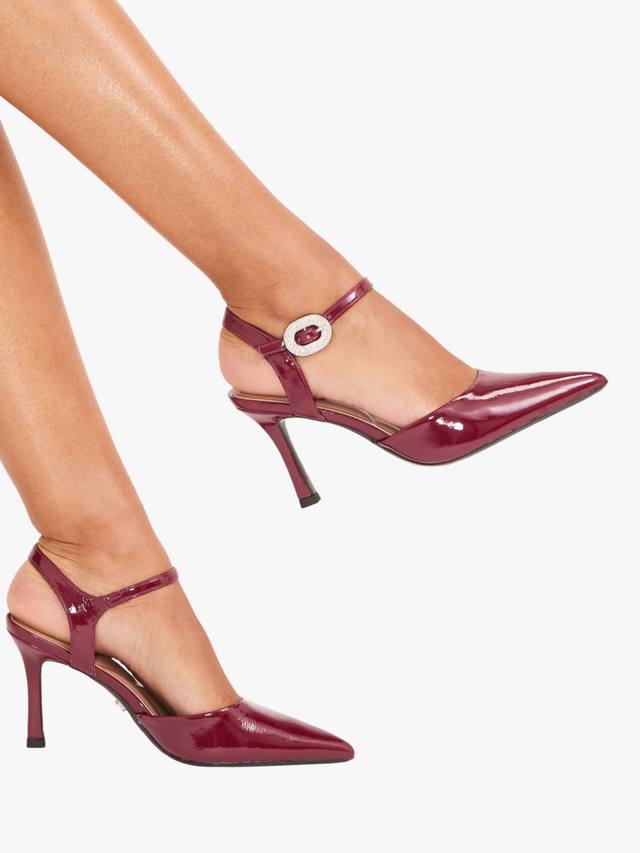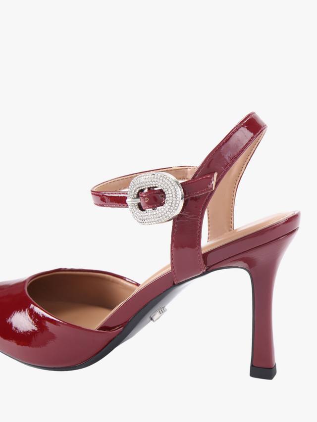 Пара лакированных туфель-лодочек на высокой шпильке с острым закрытым носком и декоративным креплением на пряжке. Изящный силуэт и каблук высотой 8 см создают четкий профиль, обеспечивая комфорт и стильный вид на весь вечер.