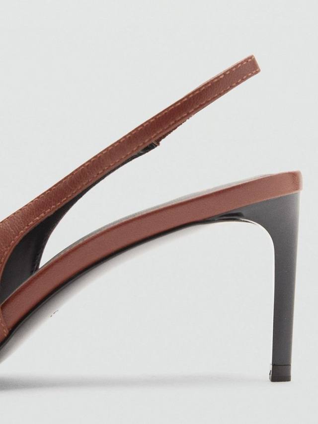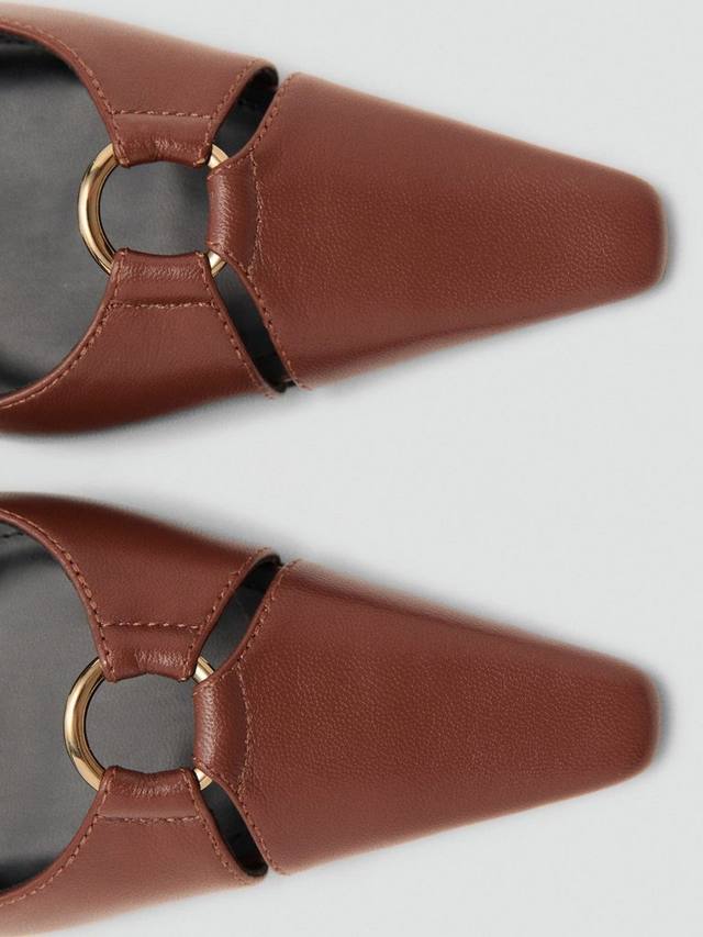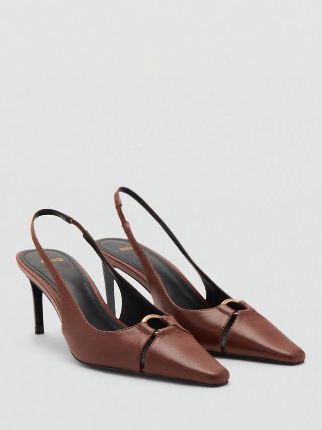 Эти туфли-лодочки из козьей кожи с ремешком на пятке имеют каблук-шпильку, острый носок, металлическое кольцо и вырезную деталь.