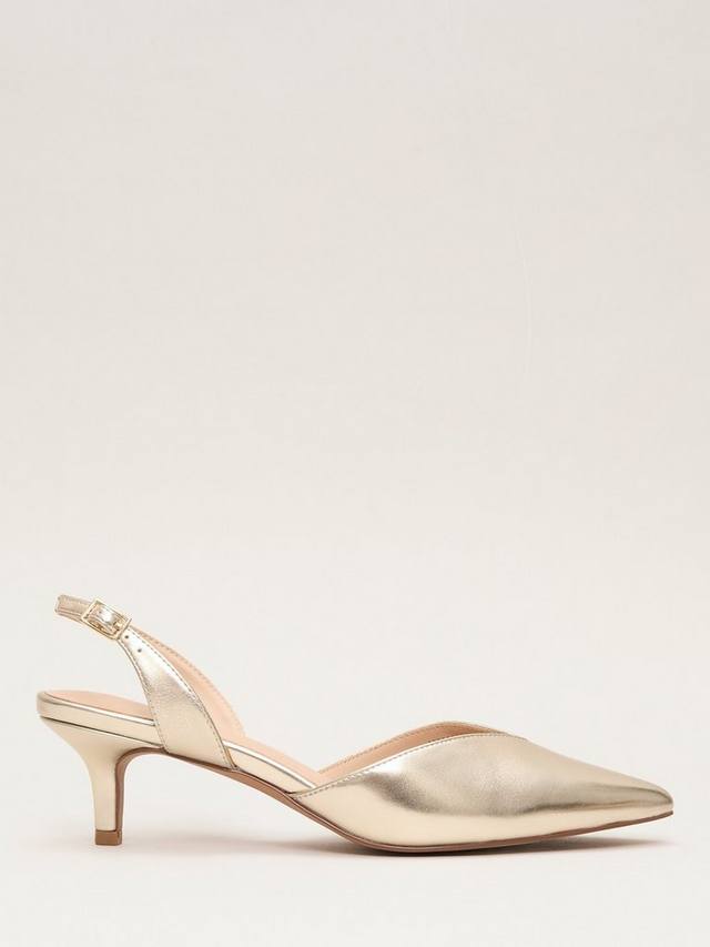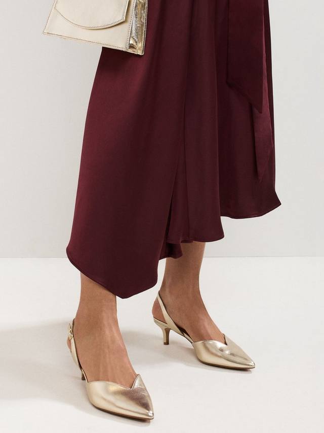 В каждом гардеробе должны быть классические туфли на каблуке рюмочка с острым носком. Эти металлические туфли идеально подходят для ношения как днем, так и вечером. Дополните образ клатчем для создания элегантного образа для торжества.