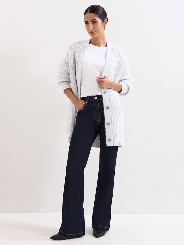 Этот удлиненный кардиган — идеальный вариант для многослойного образа в любое время года. Ребристая отделка по всей длине обеспечивает объемную, но мягкую текстуру, а застежка на пуговицы в тон создает целостный образ. Свободный удлиненный силуэт придает этому трикотажу непринужденный вид, идеально сочетаясь с вашими любимыми джинсами для создания непринужденного повседневного образа.