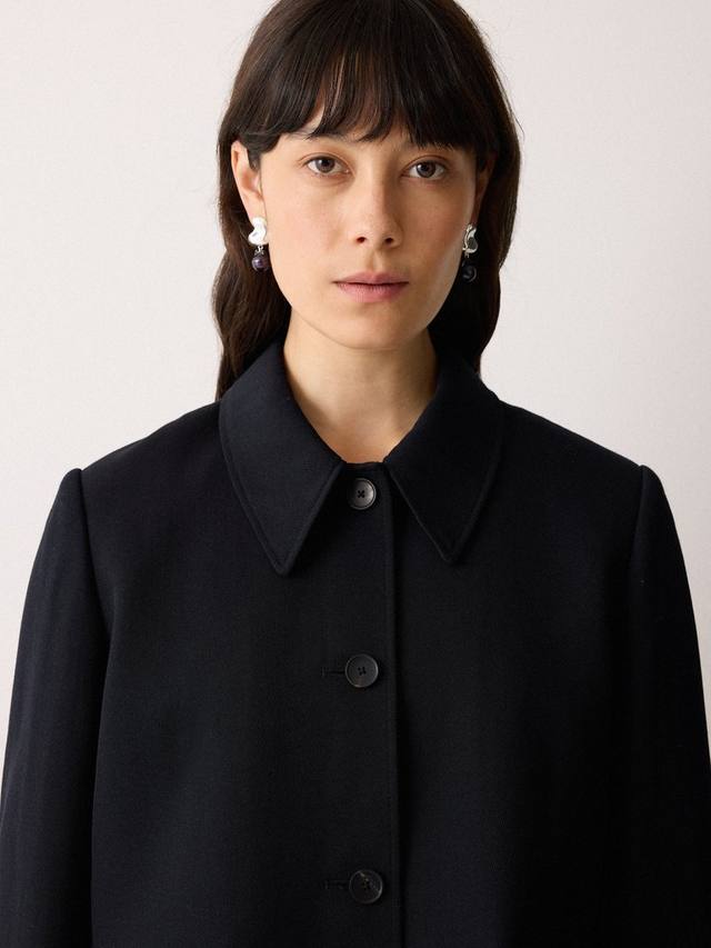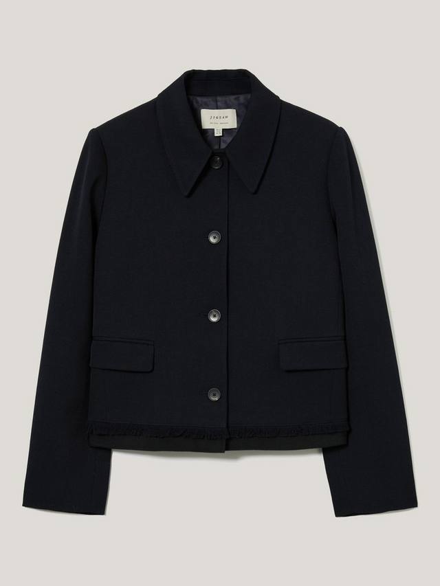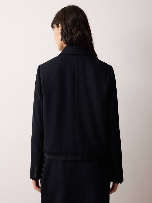 Эта укороченная куртка, изготовленная из блестящей шерстяной ткани, станет незаменимой вещью для прохладных месяцев и не только. Аутентичные детали включают контрастные пуговицы, острый воротник и отделку из репсовой ленты над подолом, что придает дополнительную дозу женственности.