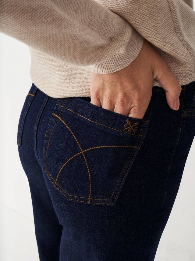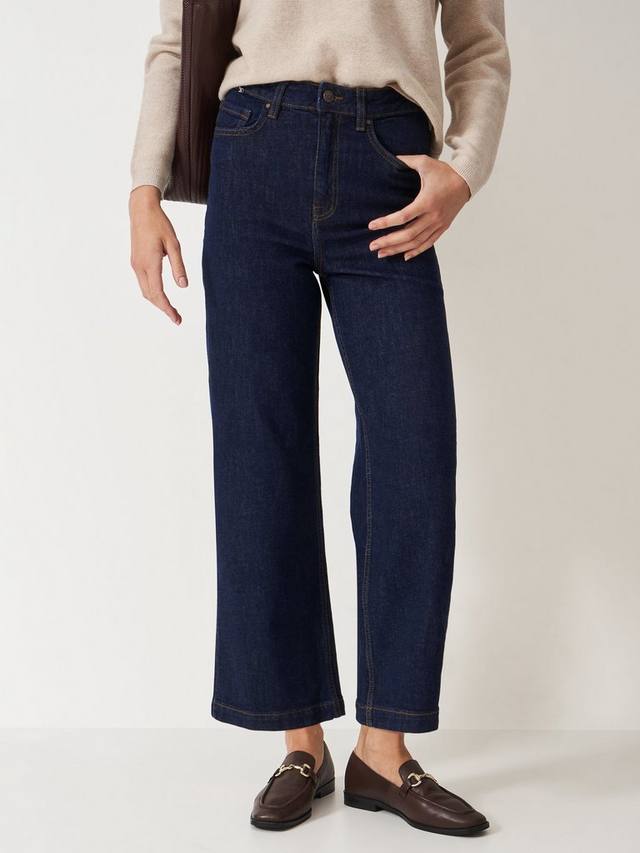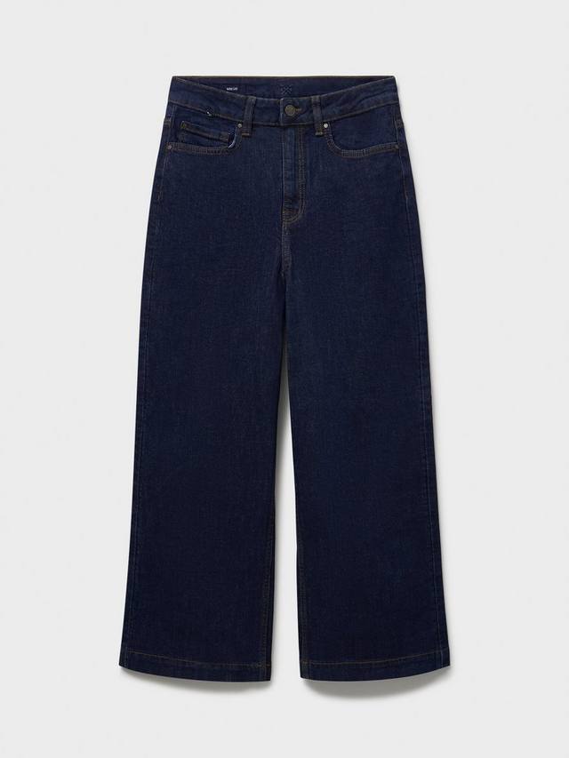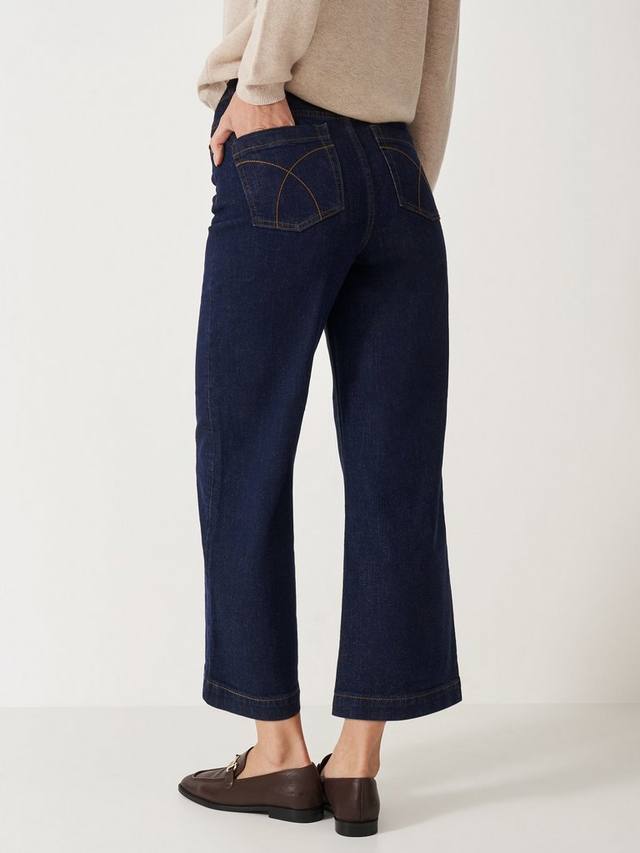 Укороченные джинсы широкого кроя из хлопка с добавлением эластана для комфортной эластичности. Модель с пятью карманами и функциональными деталями, такими как шлевки для ремня, потайная молния и фирменные заклёпки. Длина выше щиколотки идеально подходит для повседневного образа.