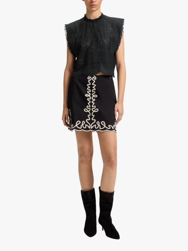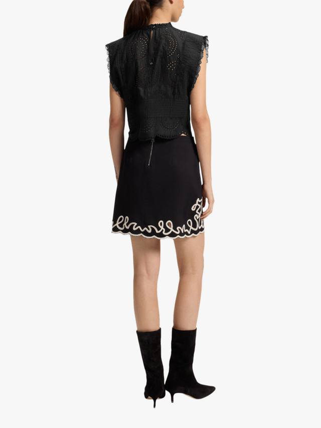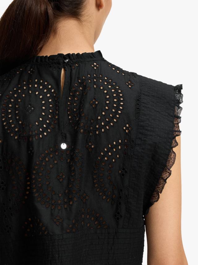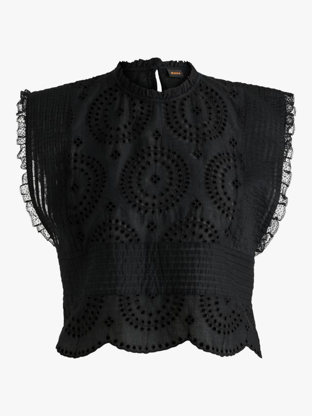 Эта блузка от BOSS из мягкого дышащего хлопка отличается простым кроем, высоким круглым вырезом и фестончатым подолом. Рукава-крылышки отделаны кружевом, а брошь англез – незаменимый элемент одежды для теплой погоды.