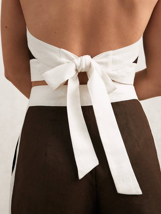 Этот укороченный топ с халтер-холкой добавит изящного контраста вашему летнему гардеробу. Сшитый из льна, он сохраняет прохладу, а цветовые блоки вызывают интерес.