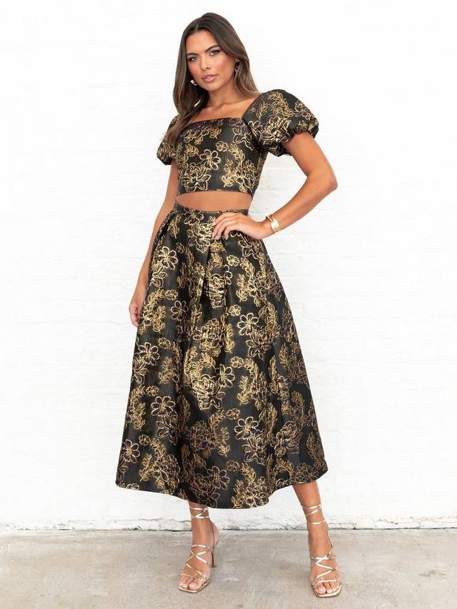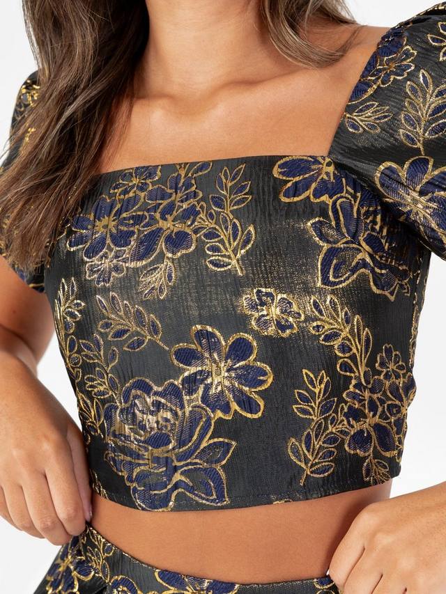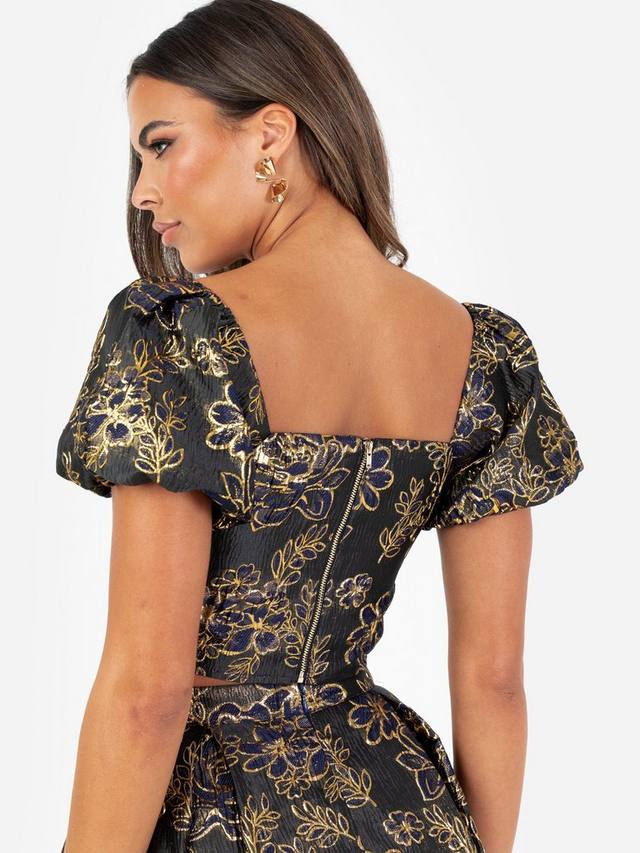 Этот укороченный топ с квадратным вырезом и рукавами-буфами, выполненный из фактурного цветочного жаккарда, украшенного мерцающими контурами и изящными акцентами, сочетает в себе современную утонченность и причудливое очарование. Застежка-молния сзади.