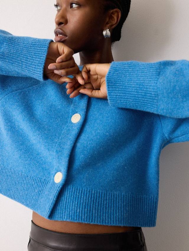 Этот кардиган свободного укороченного кроя станет универсальным предметом многослойного гардероба на все времена года. Мягкий шерстяной трикотаж дополнен мятно-зеленым оттенком и контрастными пуговицами, создающими изящный акцент. Идеально подходит для ношения поверх одежды с высокой посадкой.