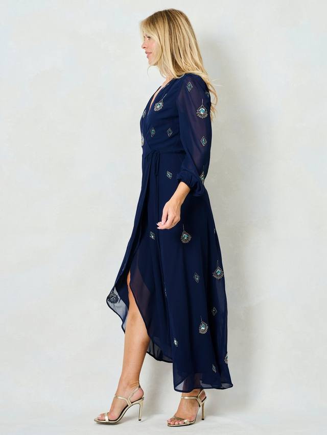 Harper демонстрирует лучшие образцы отделки и дизайна Hope & Ivy: сверкающие украшения украшают основу этого сказочного вечернего платья. Длинные рукава-блузон, женственный V-образный вырез и подчеркивающий фигуру пояс создают потрясающий силуэт, который непременно привлечёт внимание.