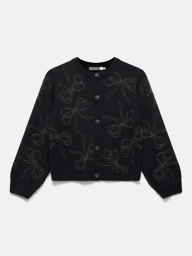 Черный кардиган с круглым вырезом, длинными рукавами, декорированным бантом и застежкой на хрустальные пуговицы спереди.