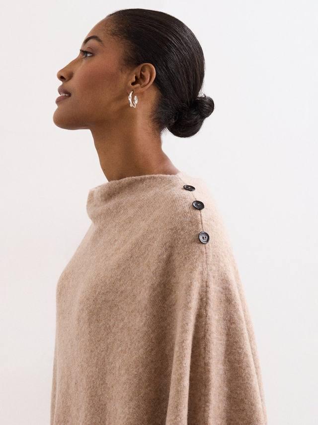 Обновите свою коллекцию трикотажных изделий этим мягким пончо ручной вязки. Выполнено в классическом цвете и дополнено контрастными пуговицами на плече для дополнительной выразительности. Это пончо элегантно струится по телу, что делает его идеальным элементом многослойной одежды для холодных месяцев.