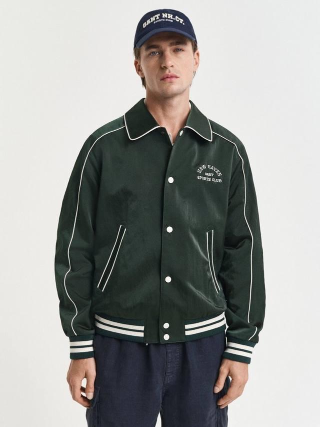 Эта модель от GANT, вдохновлённая спортивными куртками, имеет классический крой и заканчивается чуть выше бёдер. Верхняя часть выполнена из синтетического материала с водоотталкивающей пропиткой, обеспечивающей прочность и защиту от непогоды. Внешняя часть украшена деталями в университетском стиле, такими как полосатая резинка, застёжка на кнопках, кант по контуру и вышивка на груди и спине.