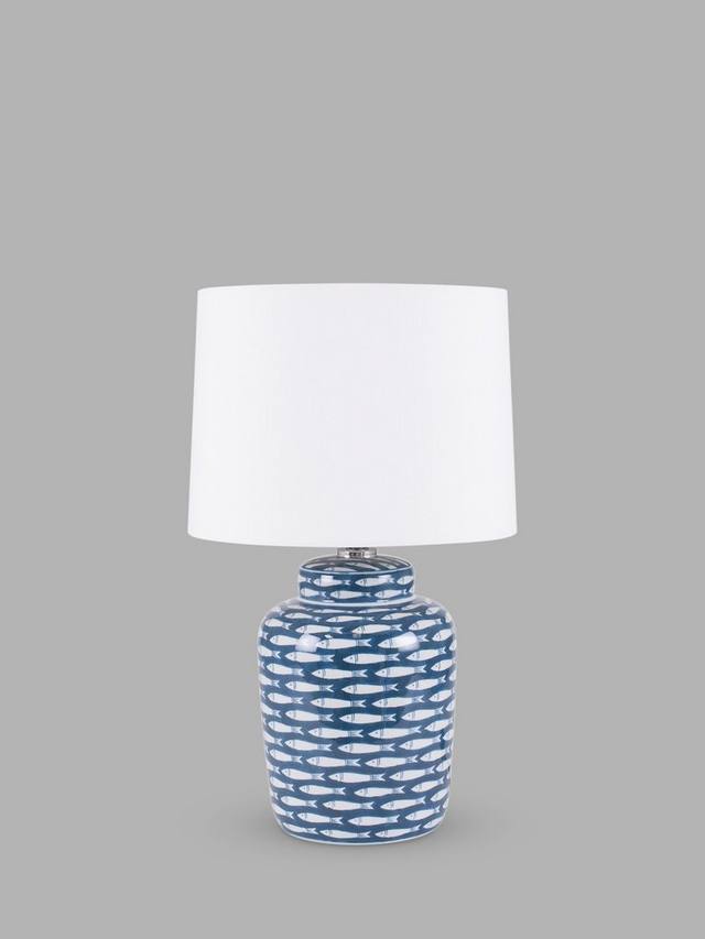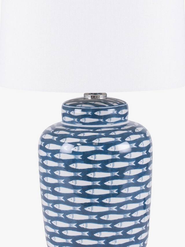 Эта керамическая лампа в мечтательном темно-синем и белом цвете имеет напечатанный повторяющийся рисунок рыбы и дополняющий ее конический текстурированный абажур из кремового хлопка.