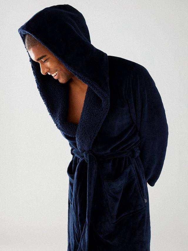 Побалуйте себя абсолютным комфортом в этом флисовом халате классического темно-синего цвета. Изготовленный из мягчайшего переработанного полиэстера, сертифицированного GRS, этот халат невероятно пушистый и уютный. Пушистый капюшон обеспечивает дополнительное тепло, а завязка на талии обеспечивает плотную посадку и поддержку. Он идеально подходит для отдыха или чтения любимой книги.