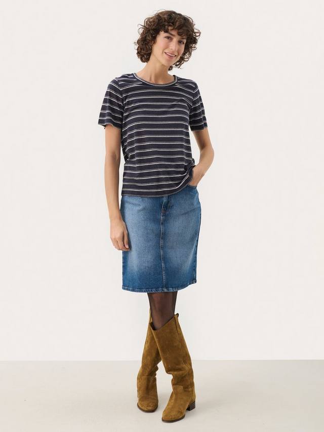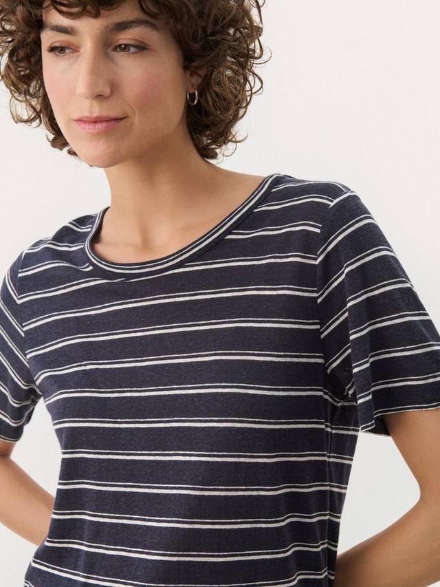 Эта футболка Nacima с узкими белыми полосками — классика гардероба. Круглый вырез и свободный крой делают её одновременно удобной и стильной. Идеально подходит для повседневной носки, в сочетании с джинсами или шортами для создания непринуждённого образа.