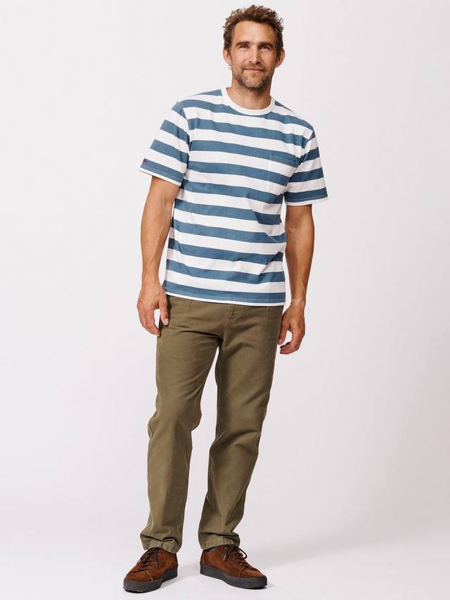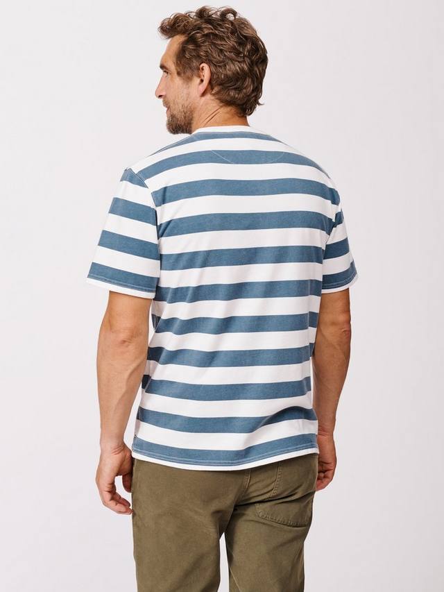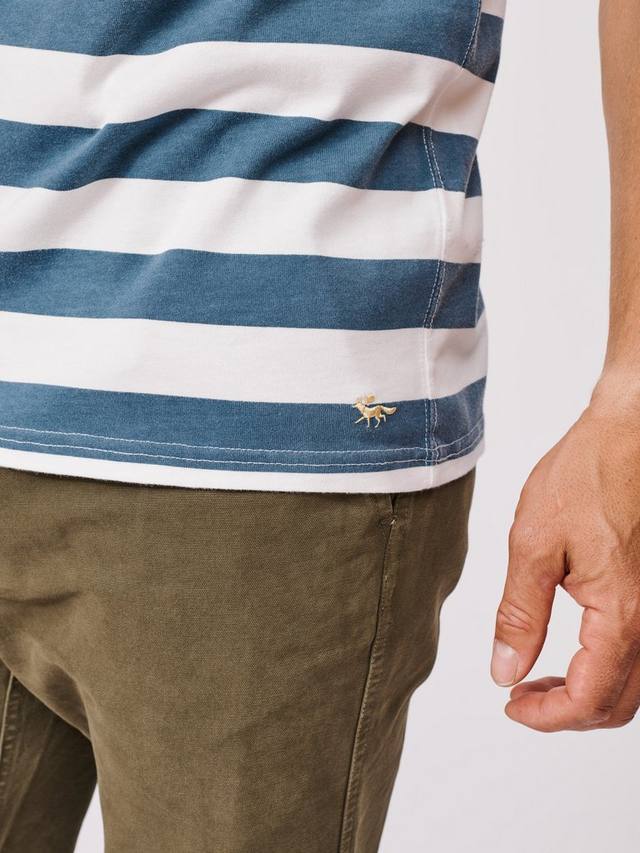 Свободная хлопковая футболка с круглым вырезом, джинсовой синей полосой и вышитым логотипом на подоле.