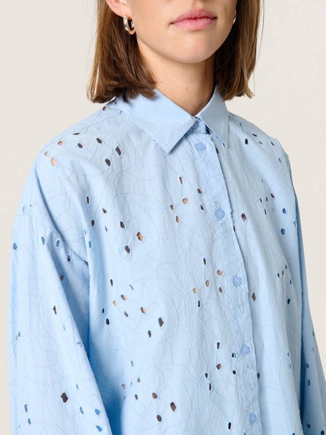 Если вам нужна женственная альтернатива классической рубашке, рубашка SLIva – это то, что вам нужно. Она сшита из красивой ткани с англезной вышивкой и имеет свободный крой со спущенными плечами. Длинные рукава, широкий крой и манжеты на пуговицах, а рубашка отрезная по бедрам с закругленным разрезом по низу.