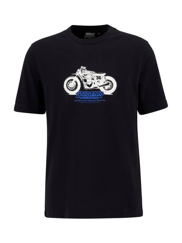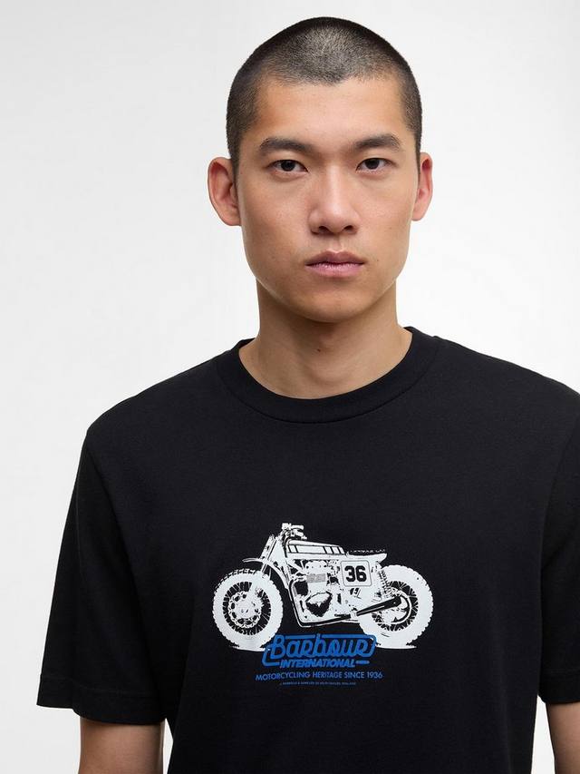 История Barbour International началась в 1936 году, когда Дункан Барбур, представитель третьего поколения семьи Барбур и страстный мотоциклист, разработал цельный вощеный хлопковый костюм для международных шестидневных гонок. Футболка с принтом B.Intl Cruise Graphic отдает дань уважения этому году, положившему начало всему.