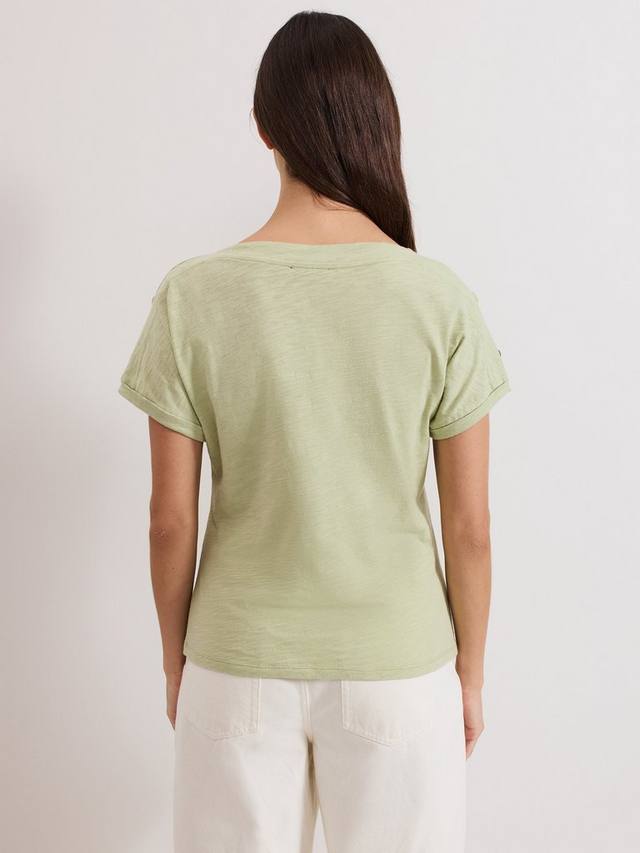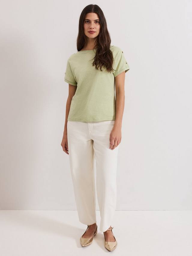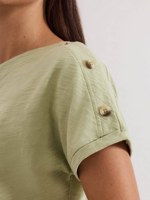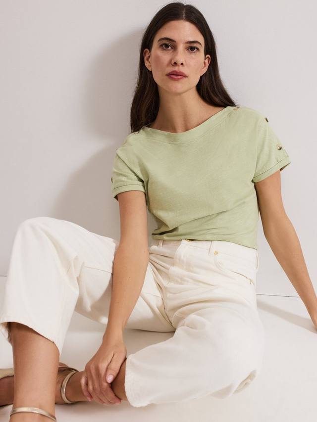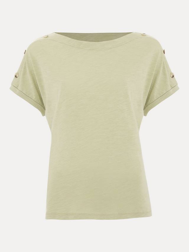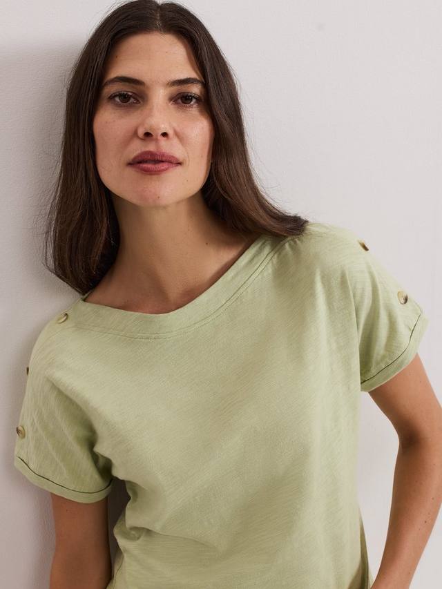 Эта футболка из 100% хлопка станет отличным дополнением к вашему базовому гардеробу. Футболка в оттенке, идеально подходящем для создания ненавязчивых цветовых акцентов, дополнена современным косым вырезом и пуговицами в черепаховой расцветке на плече для создания изысканного образа. Носите её с любимыми вещами круглый год.